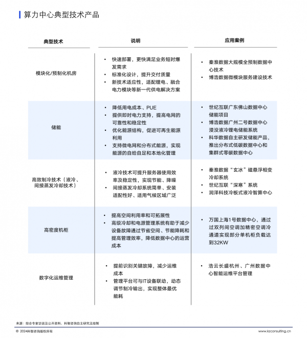 算力中心技术产品呈现绿色化、集约化、智能化、高可靠性发展趋势。目前,服务商通过自研相关技术、加强生态合作等方式提升技术水平,加强预制模块化、高压直流、储能、间接蒸发冷却、液冷、智能运维等技术的应用推广,推动算力中心绿色化、高效化发展。